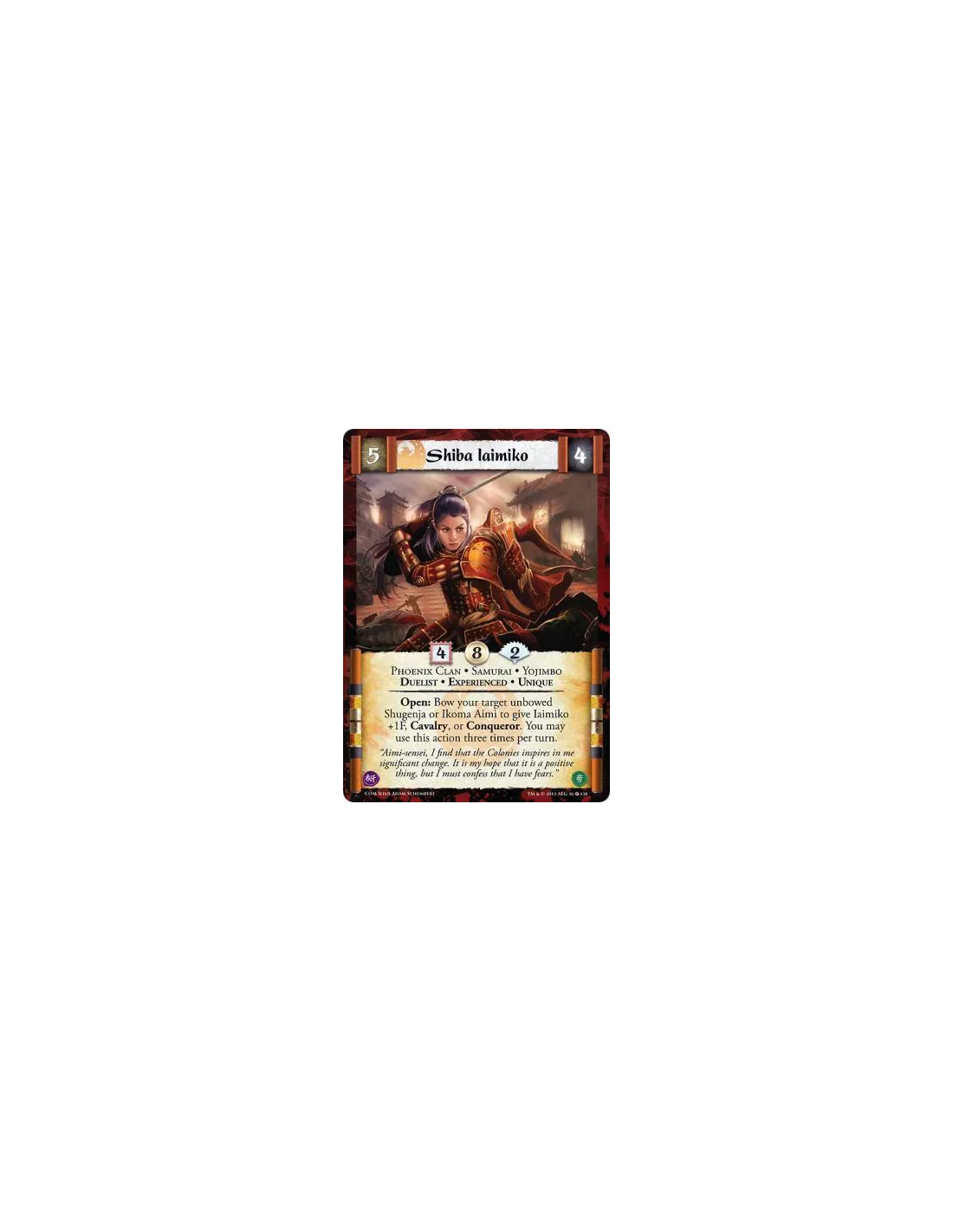 Open: Bow your target unbowed Shugenja or Ikoma Aimi to give Iaimiko +1F, Cavalry, or Conqueror. You may use this action three times per turn.