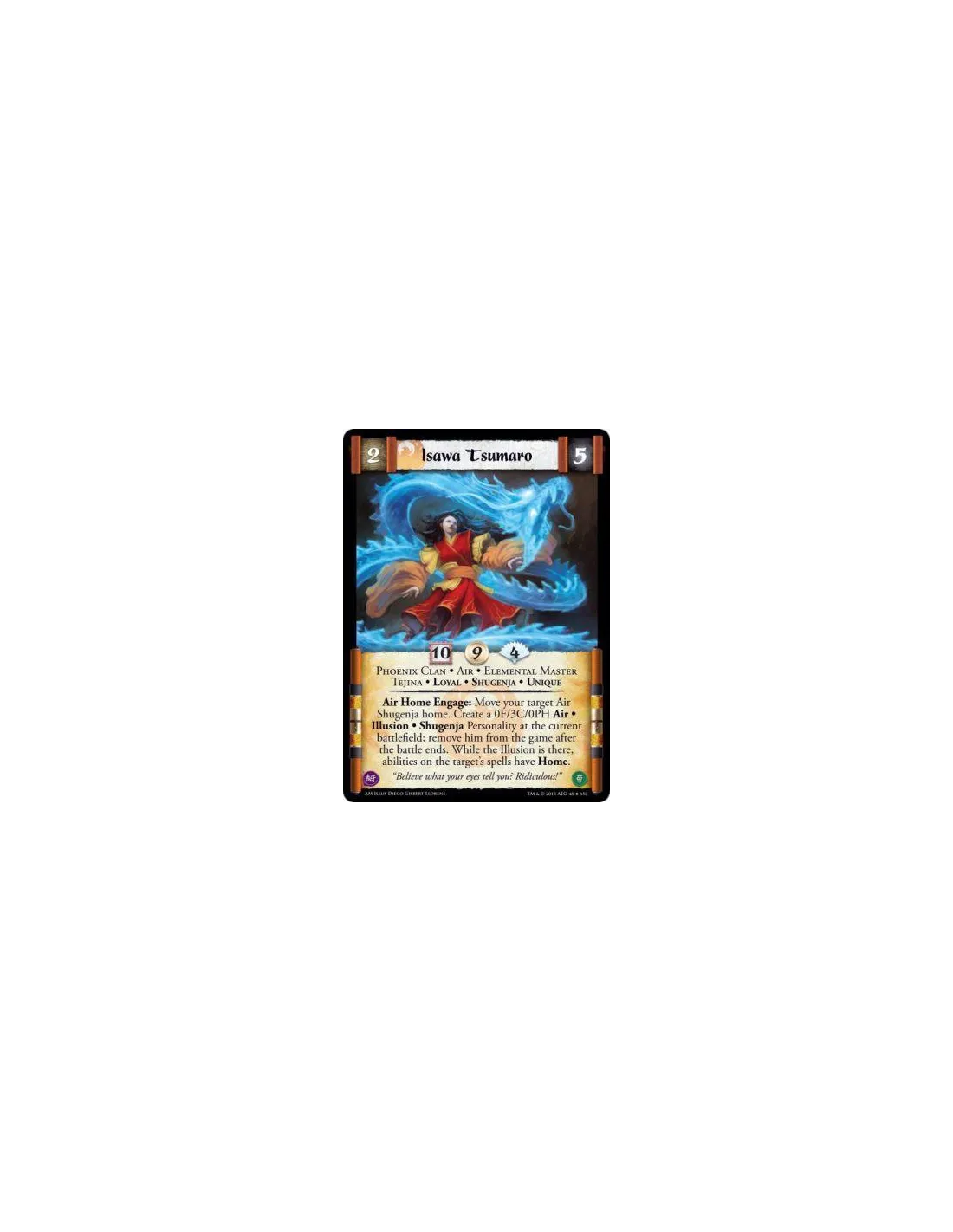 Air Home Engage: Move your target Air Shugenja home. Create a 0F/3C/0PH Air • Illusion • Shugenja Personality at the current battlefield; remove him from the game after the battle ends. While the Illusion is there, abilities on the target's spells have Home.