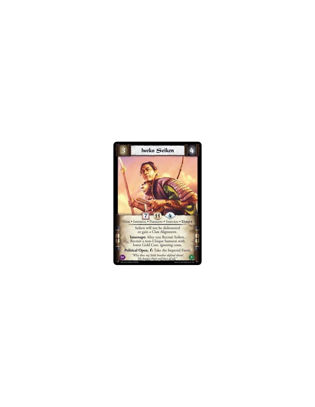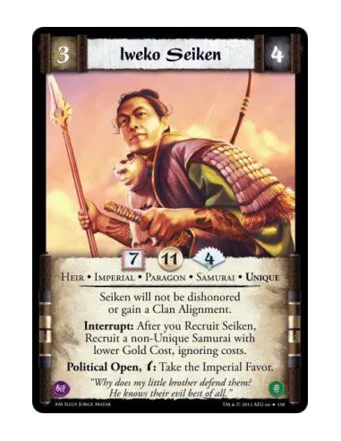 Interrupt: After you Recruit Seiken, Recruit a non-Unique Samurai with lower Gold Cost, ignoring costs.
