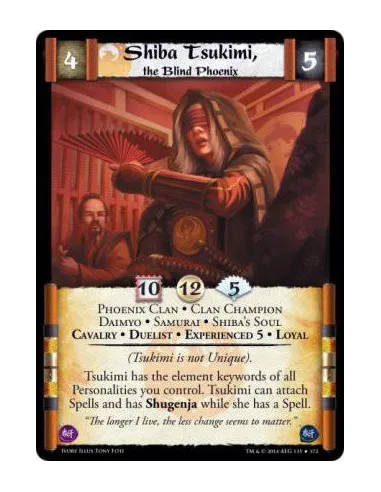 Tsukimi has the element keywords of all Personalities you control. Tsukimi can attach Spells and has Shugenja while she has a Spell.