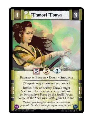 Battle: Bow or destroy Touya's target Spell to reduce a target enemy Follower or Personality's Force by the Spell's Focus Value. If the Spell was Earth, gain 1 Honor
