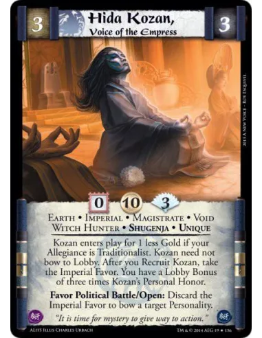 Kozan enters play for 1 less Gold if your Allegiance is Traditionalist. Kozan need not bow to Lobby. After you Recruit Kozan, take the Imperial Favor. You have a Lobby Bonus of three times Kozan's Personal Honor.