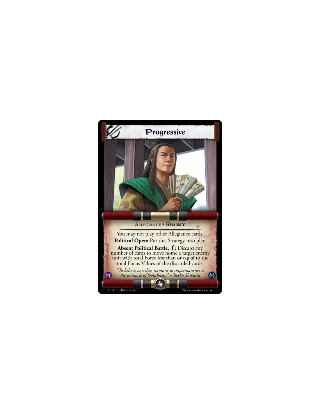 You may not play other Allegiance cards. Political Open: Put this Strategy into play. Absent Political Battle, bow: Discard any number of cards to move home a target enemy unit with total Force less than or equal to the total Focus Values of the discarded cards.