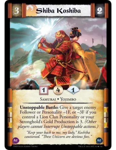 Unstoppable Battle: Give a target enemy Follower or Personality -1F, or -3F if you control a Lion Clan Personality or your Stronghold's Gold Production is 3. (Other players cannot Interrupt Unstoppable actions.)
