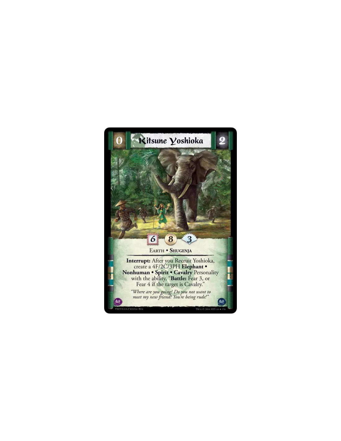 Interrupt: After you Recruit Yoshioka, create a 4F/2C/3PH Elephant • Nonhuman • Spirit • Cavalry Personality with the ability, "Battle: Fear 3, or Fear 4 if the target is Cavalry."