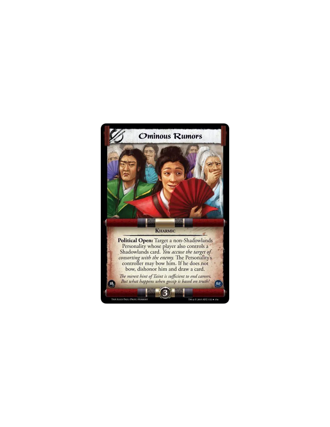 Political Open: Target a non-Shadowlands Personality whose player also controls a Shadowlands card. You accuse the target of consorting with the enemy. The Personality's controller may bow him. If he does not bow, dishonor him and draw a card.