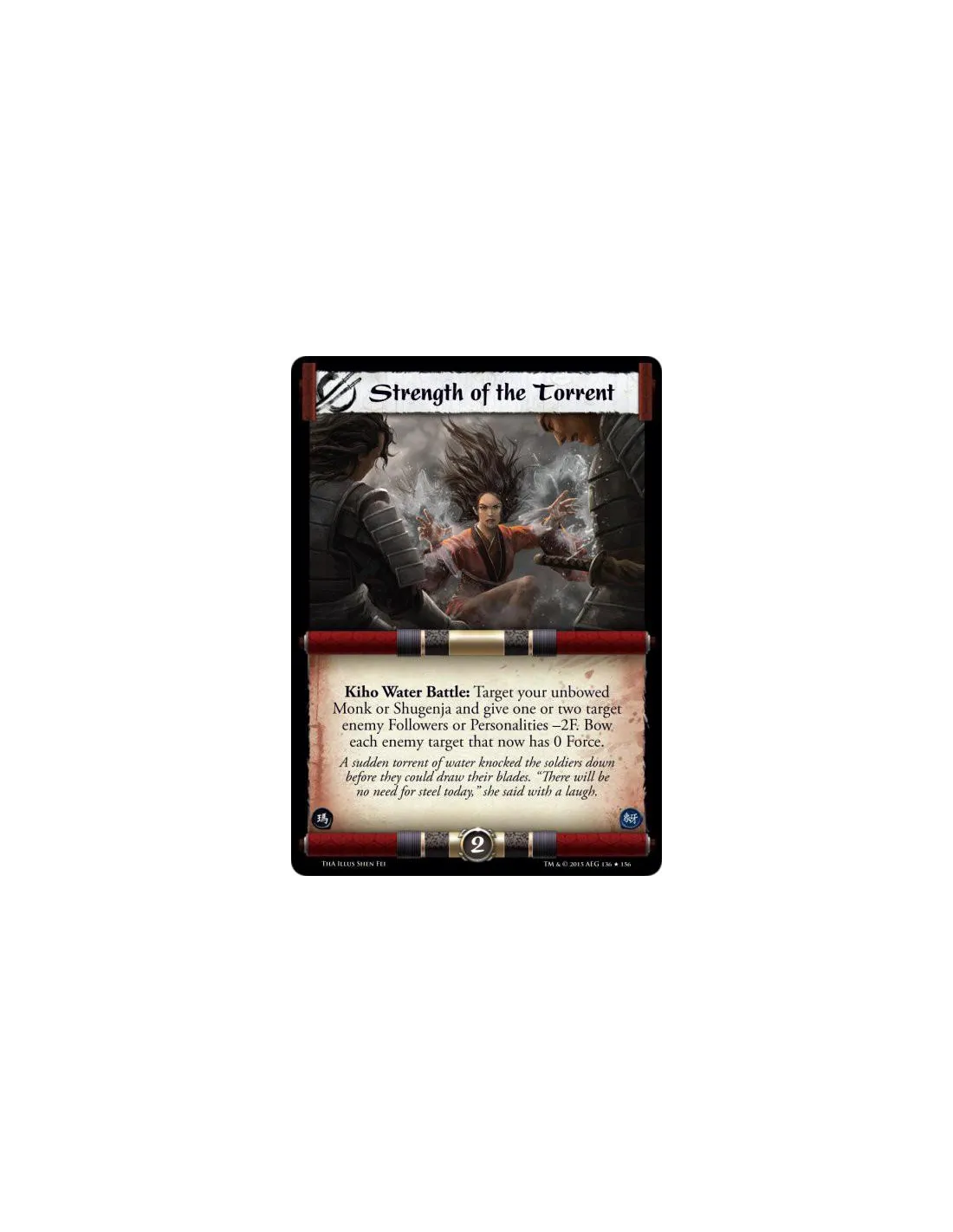 Kiho Water Battle: Target your unbowed Monk or Shugenja and give one or two target enemy Followers or Personalities -2F. Bow each enemy target that now has 0 Force.