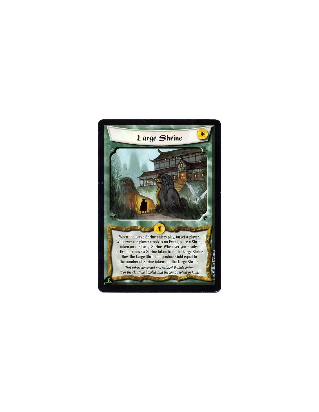 When the Large Shrine enters play, target a player. Whenever the player resolves an Event, place a Shrine token on the Large Shrine. Whenever you resolve an Event, remove a Shrine token from the Large Shrine. Bow the Large Shrine to produce Gold equal to the number of Shrine tokens on the Large Shrine.
