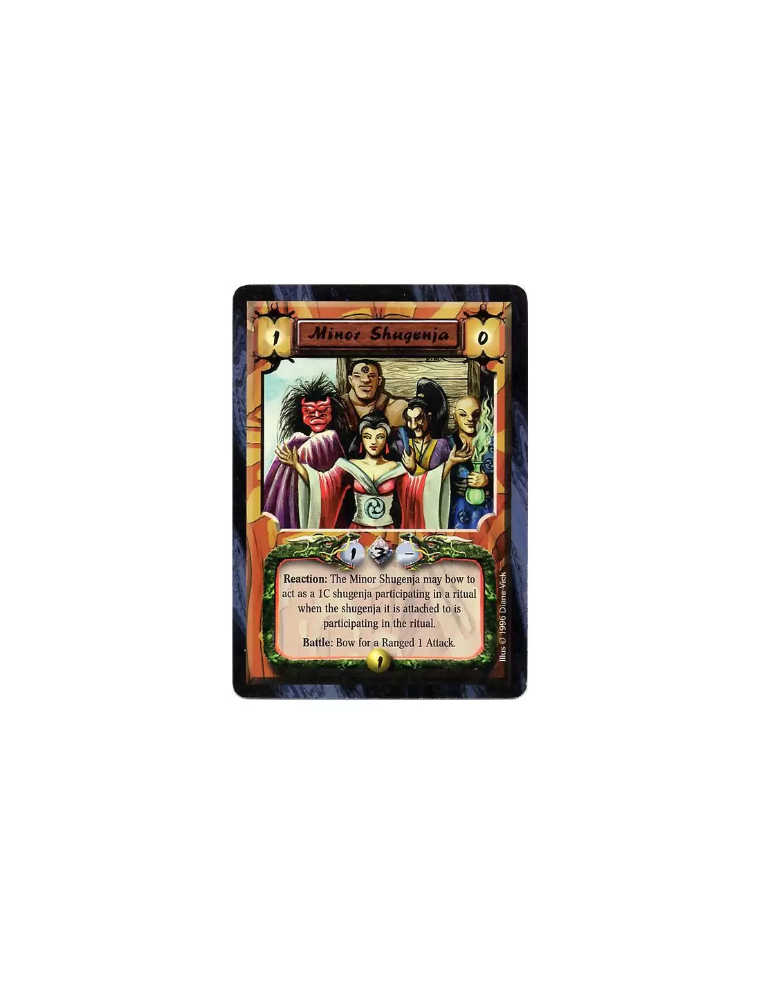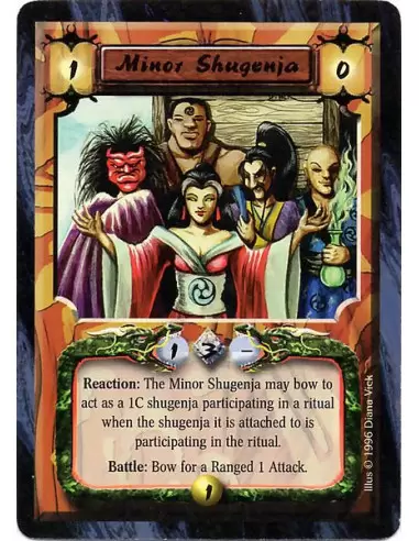 Minor Shugenja have +1C while participating in a Ritual that this Personality also participates in. (Followers cannot cast Kihos.) Battle: Bow Minor Shugenja for a Ranged 1 Attack.