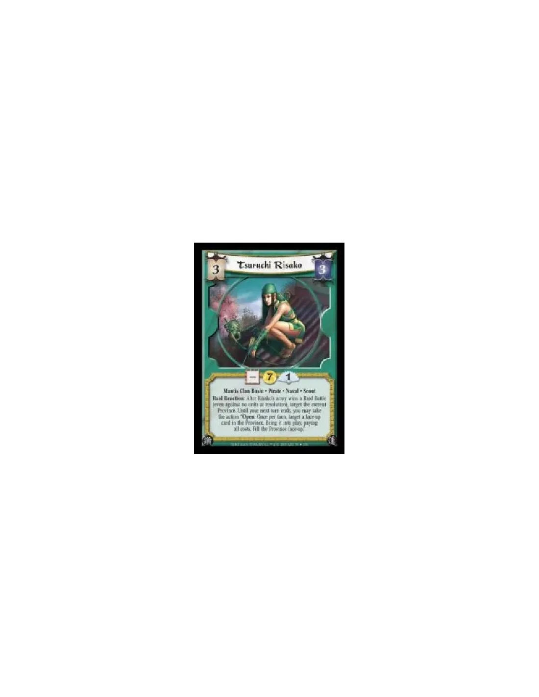 Mantis Clan Bushi · Pirate · Naval · Scout. Raid Reaction: After Risako's army wins a Raid Battle (even against no units at resolution), target the current Province. Until your next turn ends, you may take the action ?Open: Once per turn, target a face-up card in the Province. Bring it into play, paying all costs. Fill the Province face-up.?