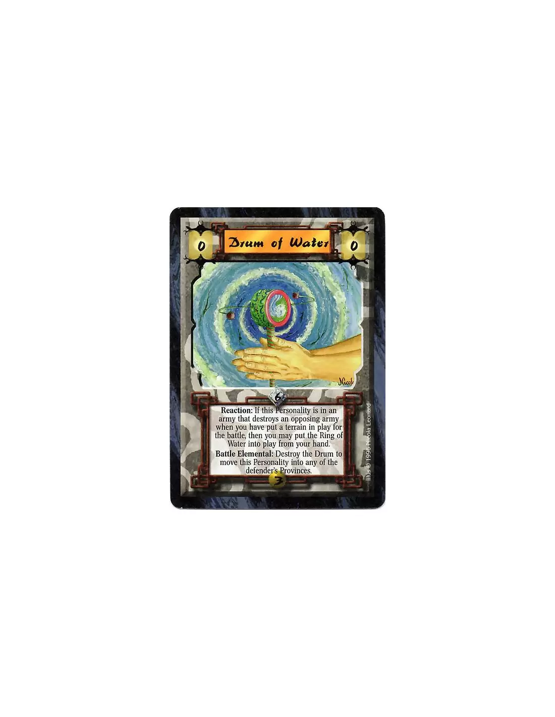 Reaction: If this Personality is in an army that destroys an opposing army when you have put a terrain in play for the battle, then you may put the Ring of Water into play from your hand. Battle Elemental: Destroy the Drum to move this Personality into any of the defender's Provinces.