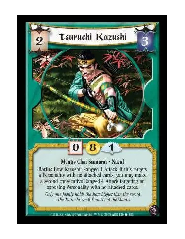Mantis Clan Samurai · Naval. Battle: Bow Kazushi: Ranged 4 Attack. If this targets a Personality with no attached cards, you may make a second consecutive Ranged 4 Attack targeting an opposing Personality with no attached cards