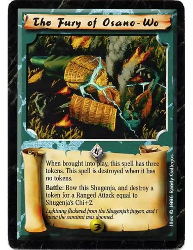 The Fury of Osano-Wo  - When you bring this Spell into play, place three tokens on it. When this Spell has no tokens, destroy it