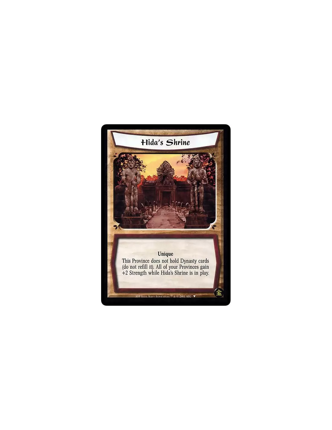 Unique This Province does not hold Dynasty cards (do not refill it). All of your Provinces gain +2 Strength while Hida's Shrine is in play.