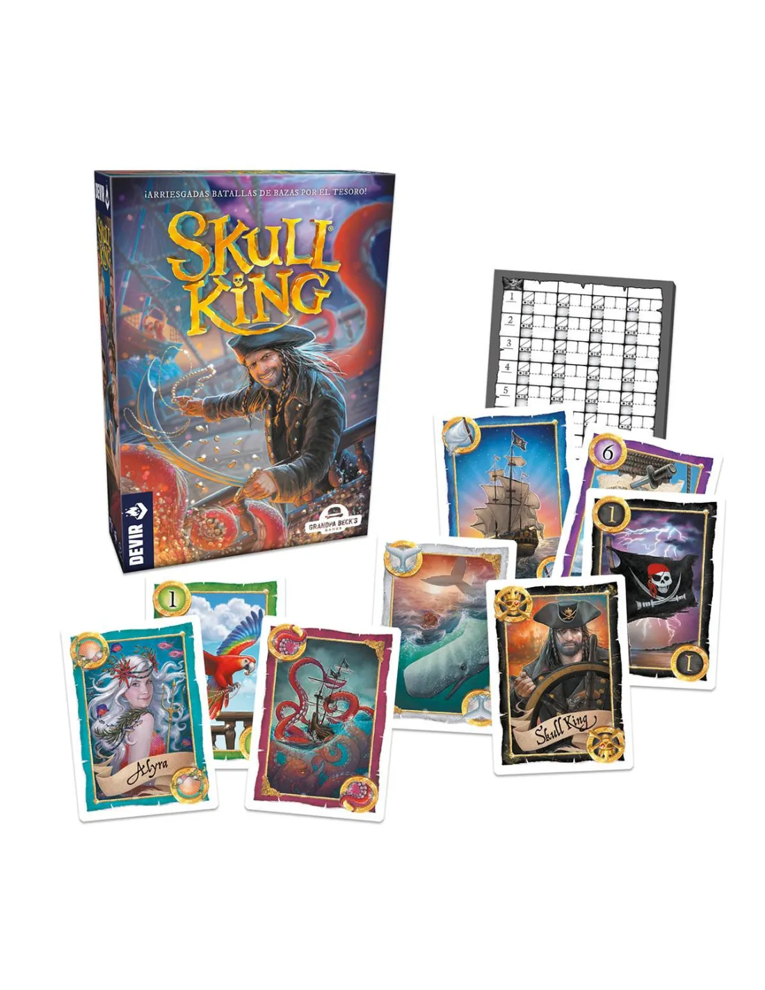 Pero por los siete mares... ¿De qué trata este juego? Skull King es en esencia un juego de bazas: los jugadores apostarán durante varias rondas cuantas bazas creen que ganarán y si aciertan obtendrán puntos. A los que estén habituados a los clásicos juegos de naipes puede que les resulte familiar la mecánica, que es muy fácil de aprender y de aplicar, pero que requiere de mucha intuición si se quiere dominar. Skull King está diseñado por Brent Beck y Jeffrey Beck y ofrece partidas para grupos de 2 a 8 jugadores, a partir de 8 años, de unos 30 minutos de duración.