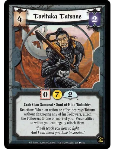 Crab Clan Samurai. Soul of Hida Tadashiro Reaction: When an action or effect destroys Tatsune without destroying any of his Followers, attach the Followers to one or more of your Personalities to whom you can legally attach them.