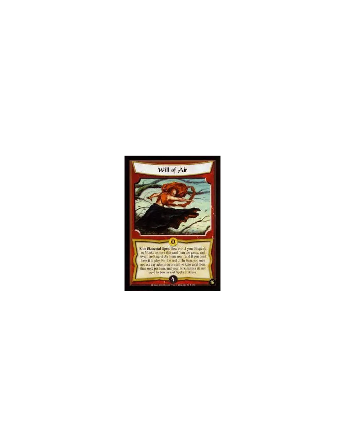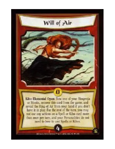 Kiho Elemental Open: Bow one of your Shugenja or Monks, remove this card from the game, and reveal the Ring of Air from your hand if you don't have it in play. For the rest of the turn, you may not use any actions on a Spell or Kiho card more than once per turn, and your Personalities do not need to bow to cast Spells or Kihos.