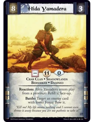 Reaction: After Yamadera enters play from a province: Refill it face-up. Battle: Target an enemy card with lower Force: Bow it.