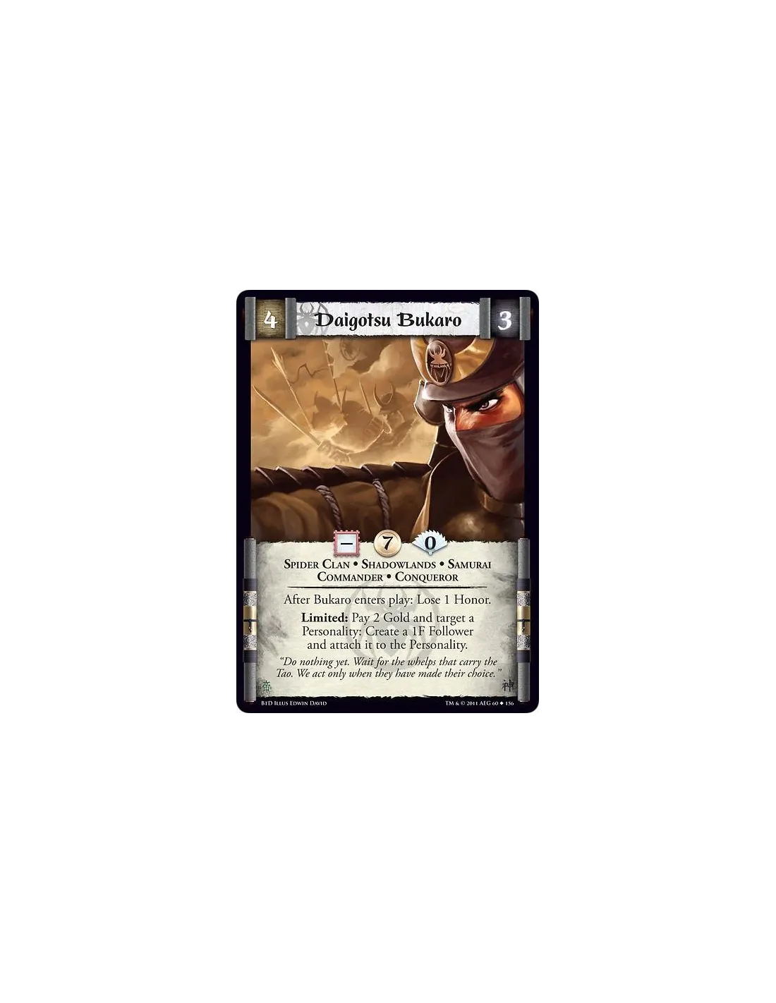 After Bukaro enters play: Lose 1 Honor. Limited: Pay 2 Gold and target a Personality: Create a 1F Follower and attach it to the Personality.