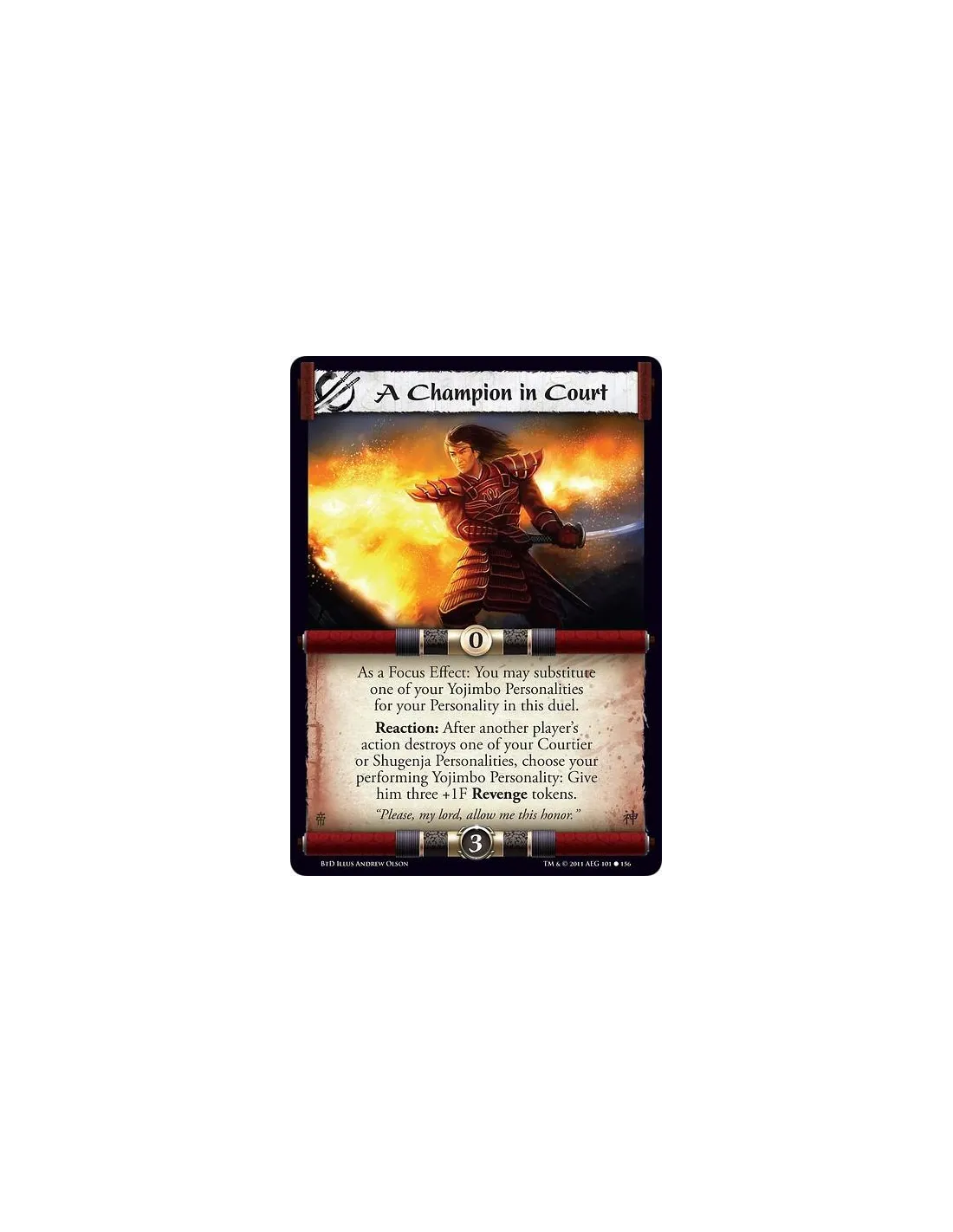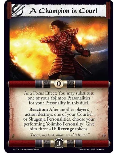 As a Focus Effect: You may substitute one of your Yojimbo Personalities for your Personality in this duel. Reaction: After another player’s action destroys one of your Courtier or Shugenja Personalities, choose your performing Yojimbo Personality: Give him three +1F Revenge tokens.