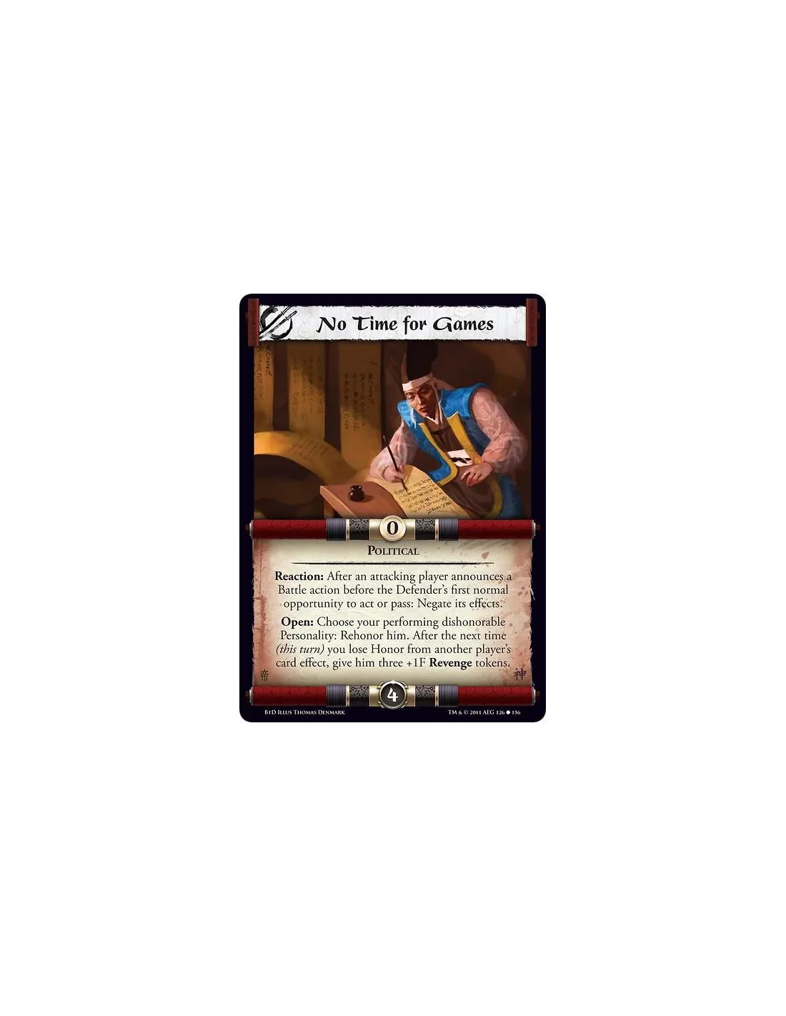 Reaction: After an attacking player announces a Battle action before the Defender’s first normal opportunity to act or pass: Negate its effects. Open: Choose your performing dishonorable Personality: Rehonor him. After the next time (this turn) you lose Honor from another player’s card effect, give him three +1F Revenge tokens.