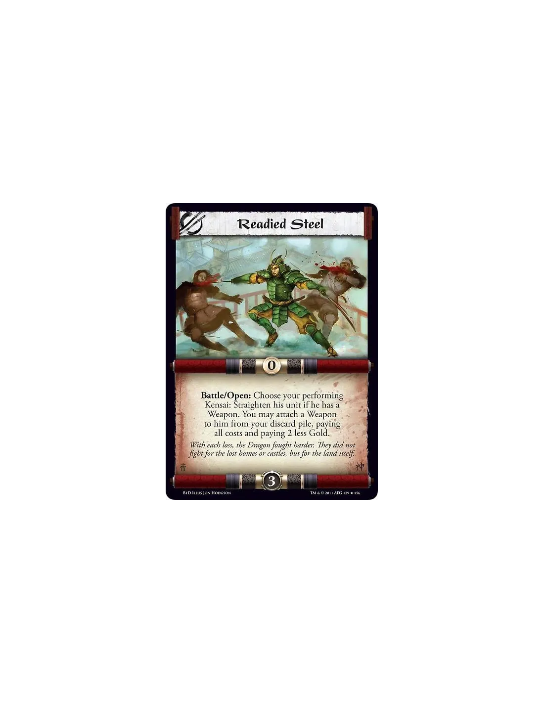 Battle/Open: Choose your performing Kensai: Straighten his unit if he has a Weapon. You may attach a Weapon to him from your discard pile, paying all costs and paying 2 less Gold.