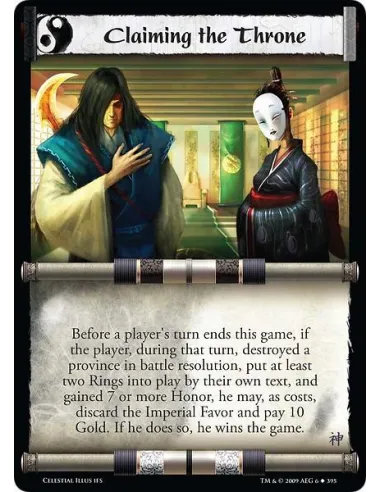 Before a player's turn ends this game, if the player, during that turn, destroyed a province in battle resolution, put at least two Rings into play by their own text, and gained 7 or more Honor, he may discard the Imperial Favor and pay 10 Gold. If he does so, he wins the game.