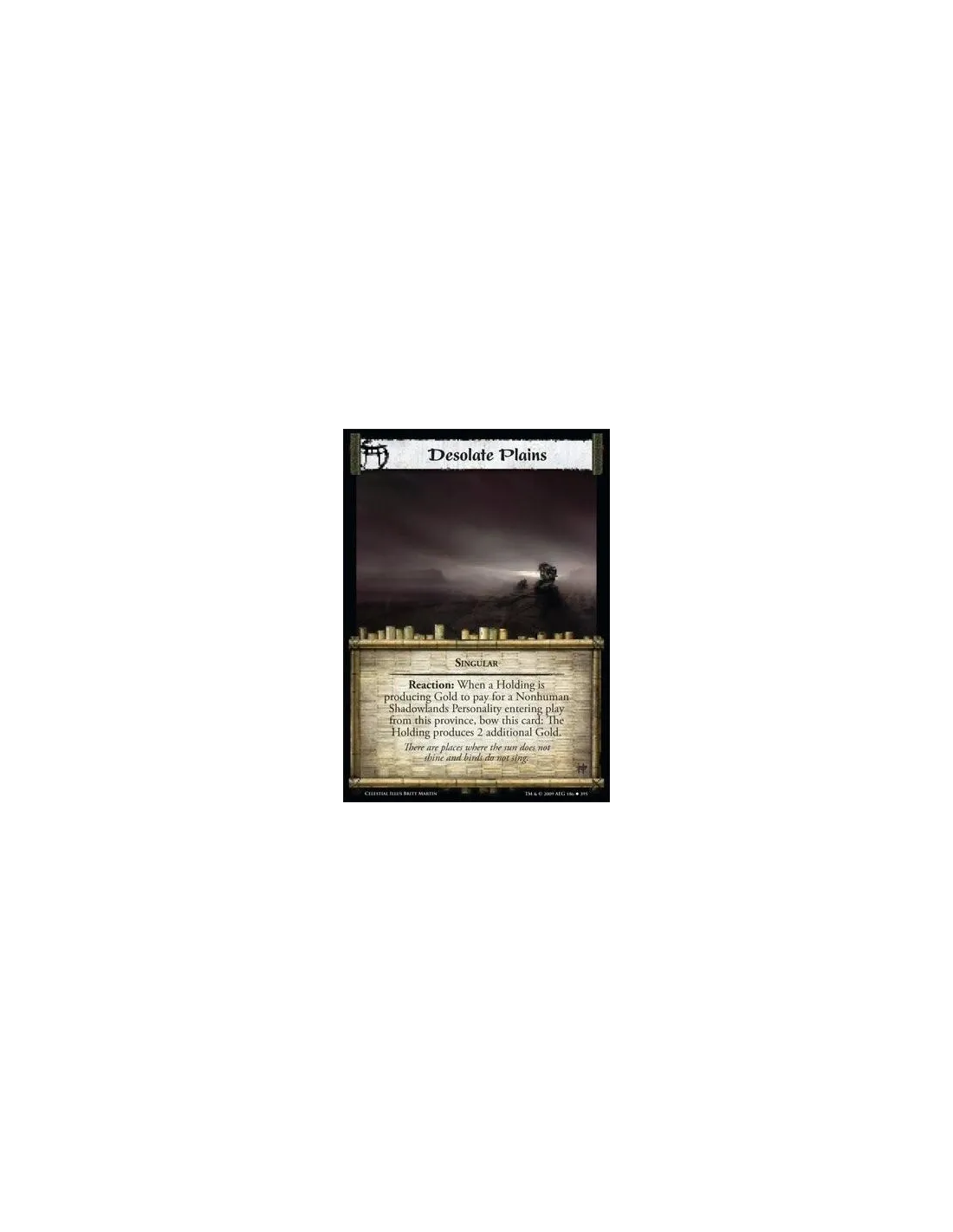 Singular Reaction: When a Holding is producing Gold to pay for a Nonhuman Shadowlands Personality entering play from this province, bow this card: The Holding produces 2 additional Gold.