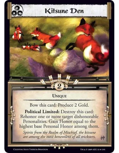 Unique Bow this card: Produce 2 Gold. Political Limited: Destroy this card: Rehonor one or more target dishonourable Personalities. Gain Honor equal to the highest base Personal Honor among them.
