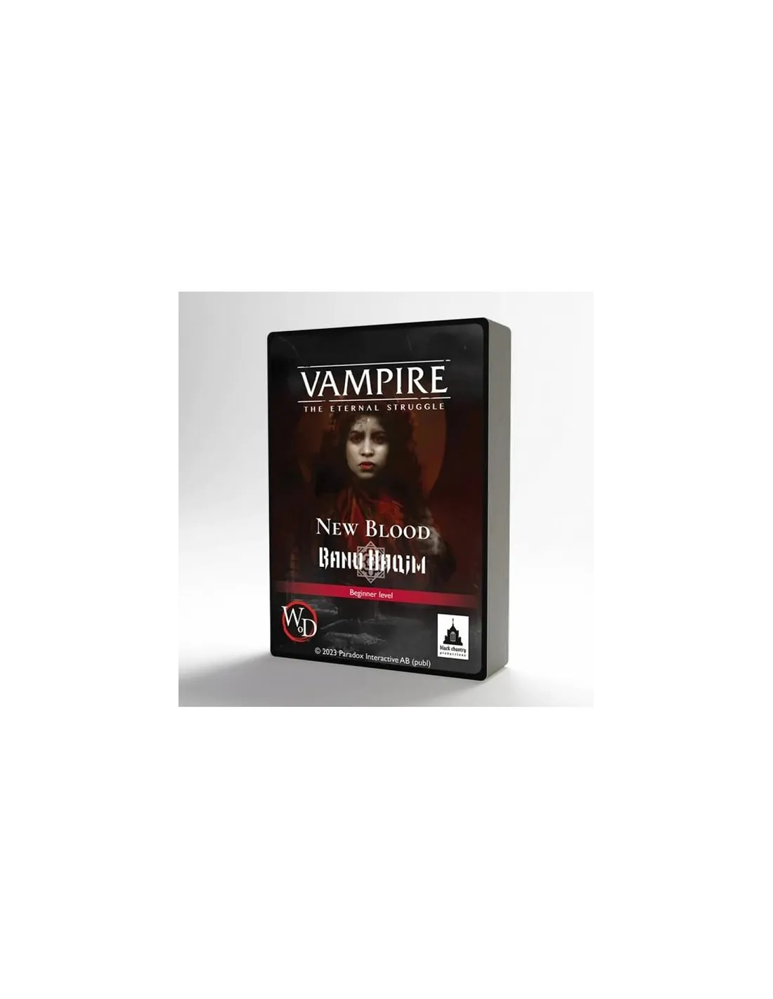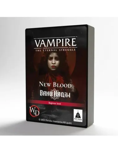 New Blood is a collection of five 55-card preconstructed decks for introductory games of Vampire: The Eternal Struggle. These decks are simpler than tournament level decks, but showcase all the basic mechanics of the game. They are balanced, for a fun and exciting first try of Vampire: The Eternal Struggle. Some of the cards included are reprints and some are new for this set, all ready to mix with cards from other sets.
