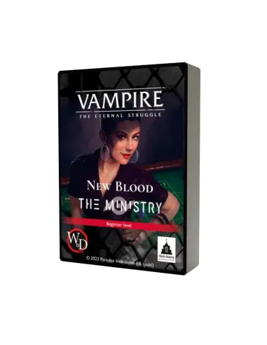 New Blood is a collection of five 55-card preconstructed decks for introductory games of Vampire: The Eternal Struggle. These decks are simpler than tournament level decks, but showcase all the basic mechanics of the game. They are balanced, for a fun and exciting first try of Vampire: The Eternal Struggle. Some of the cards included are reprints and some are new for this set, all ready to mix with cards from other sets.