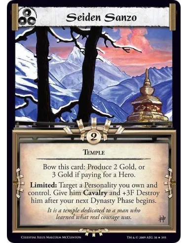 Temple Bow this card: Produce 2 Gold, or 3 Gold if paying for a Hero. Limited: Target a Personality you own and control. Give him Cavalry and +3F Destroy him after your next Dynasty Phase begins.
