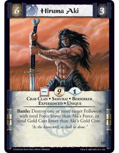 Crab Clan • Samurai • Berserker • Experienced • Unique Battle: Destroy one or more target Followers with total Force lower than Aki's Force, or total Gold Cost lower than Aki's Gold Cost.