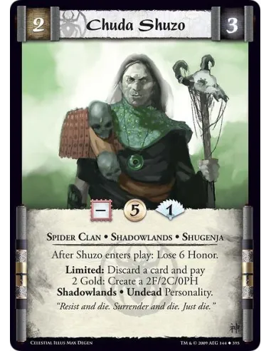 Spider Clan • Shadowlands • Shugenja After Shuzo enters play: Lose 6 Honor. Limited: Discard a card and pay 2 Gold: Create a 2F/2C/0PH Shadowlands • Undead Personality.