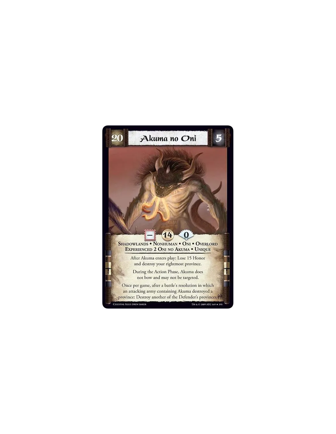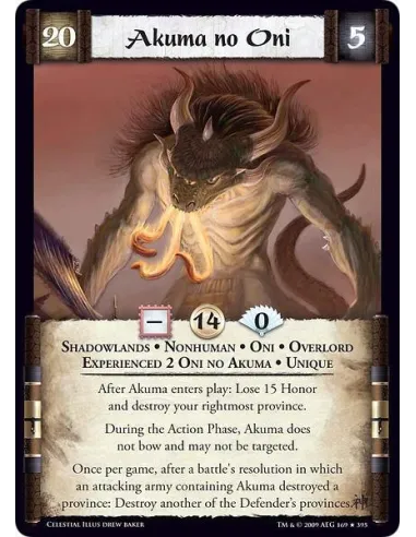Shadowlands • Nonhuman • Oni • Overlord • Experienced 2 Oni no Akuma • Unique After Akuma enters play: Lose 15 Honor and destroy your rightmost province. During the Action Phase, Akuma does not bow and may not be targeted. Once per game, after a battle's resolution in which an attacking army containing Akuma destroyed a province: Destroy another of the Defender’s provinces.