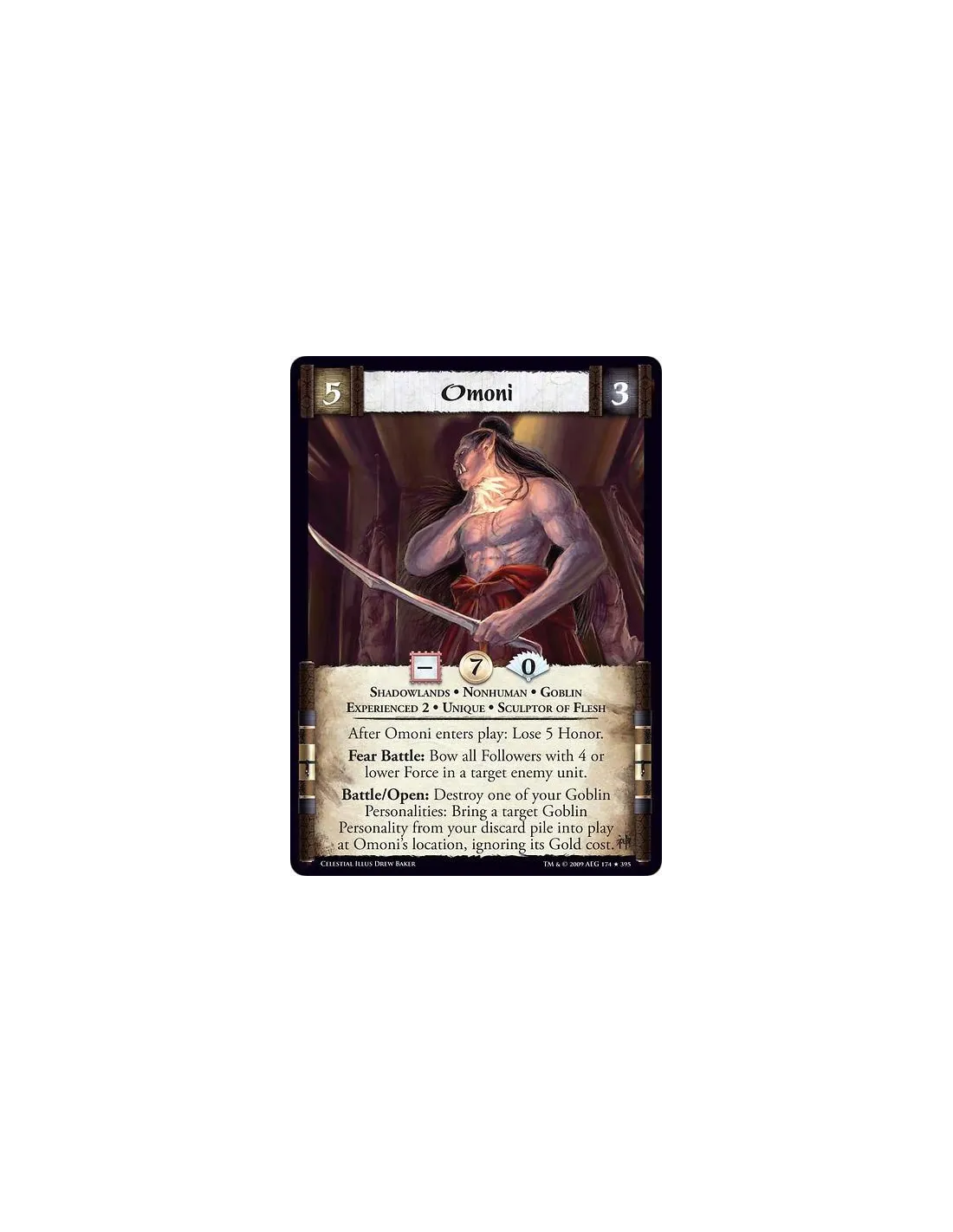 Shadowlands • Nonhuman • Goblin • Experienced 2 • Unique • Sculptor of Flesh After Omoni enters play: Lose 5 Honor. Fear Battle: Bow all Followers with 4 or lower Force in a target enemy unit. Battle/Open: Destroy one of your Goblin Personalities: Bring a target Goblin Personality from your discard pile into play at Omoni’s location, ignoring its Gold cost.