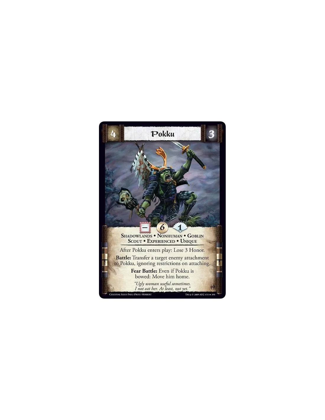 Shadowlands • Nonhuman • Goblin • Scout • Experienced • Unique After Pokku enters play: Lose 3 Honor. Battle: Transfer a target enemy attachment to Pokku, ignoring restrictions on attaching. Fear Battle: Even if Pokku is bowed: Move him home.