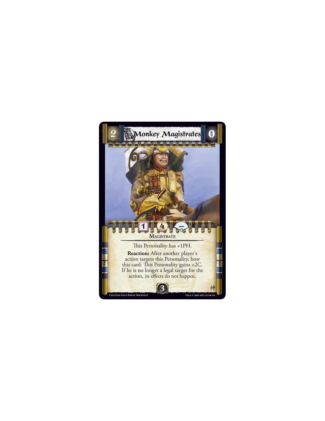 Magistrate This Personality has +1PH. Reaction: After another player's action targets this Personality, bow this card: This Personality gains +2C. If he is no longer a legal target for the action, its effects do not happen.