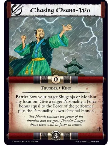 Thunder • Kiho Battle: Bow your target Shugenja or Monk at any location: Give a target Personality a Force bonus equal to the Force of the performer plus the Personality's own Personal Honor.