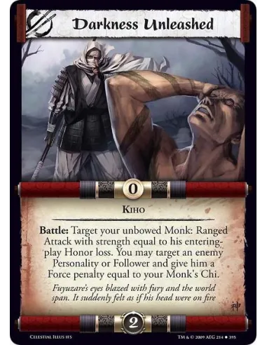Kiho Battle: Target your unbowed Monk: Ranged Attack with strength equal to his entering play Honor loss. You may target an enemy Personality or Follower and give him a Force penalty equal to your Monk's Chi.