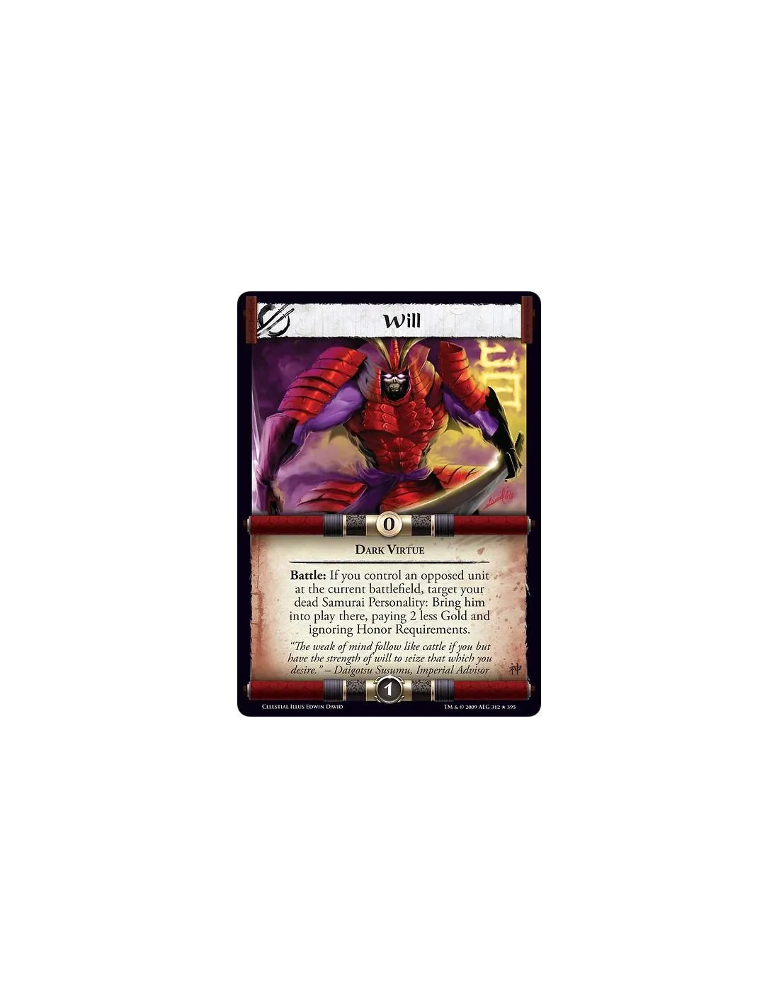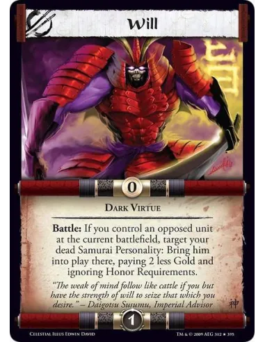 Dark Virtue Battle: If you control an opposed unit at the current battlefield, target your dead Samurai Personality: Bring him into play there, paying 2 less Gold and ignoring Honor Requirements.