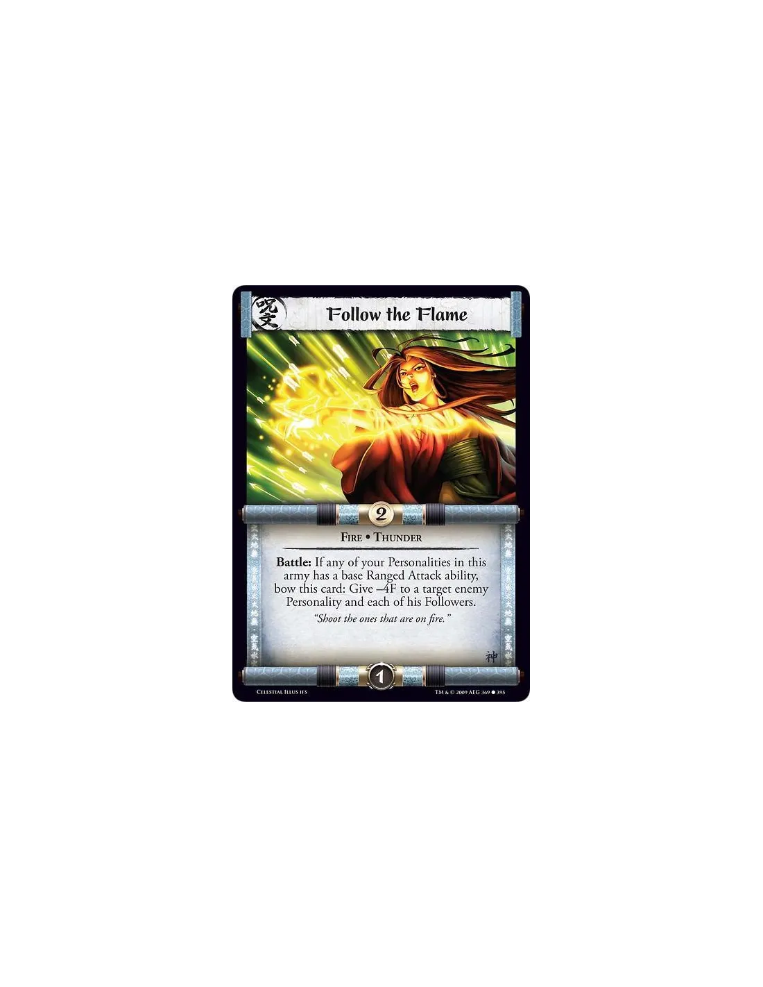 Fire • Thunder Battle: If any of your Personalities in this army has a base Ranged Attack ability, bow this card: Give -4F to a target enemy Personality and each of his Followers.