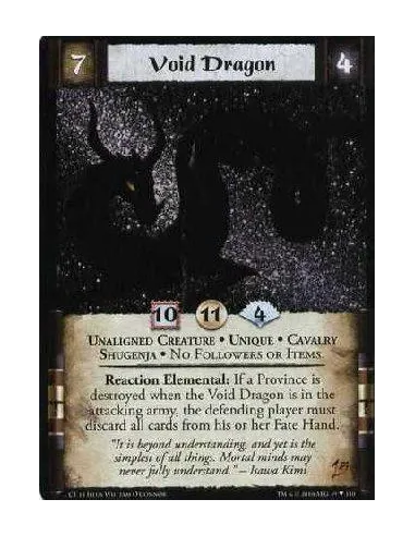 Unaligned Creature • Shugenja • Cavalry • Unique No Followers or Items. Elemental Reaction: If a province is destroyed when the Void Dragon is in the attacking army, the defending player must discard all cards from his or her fate hand.