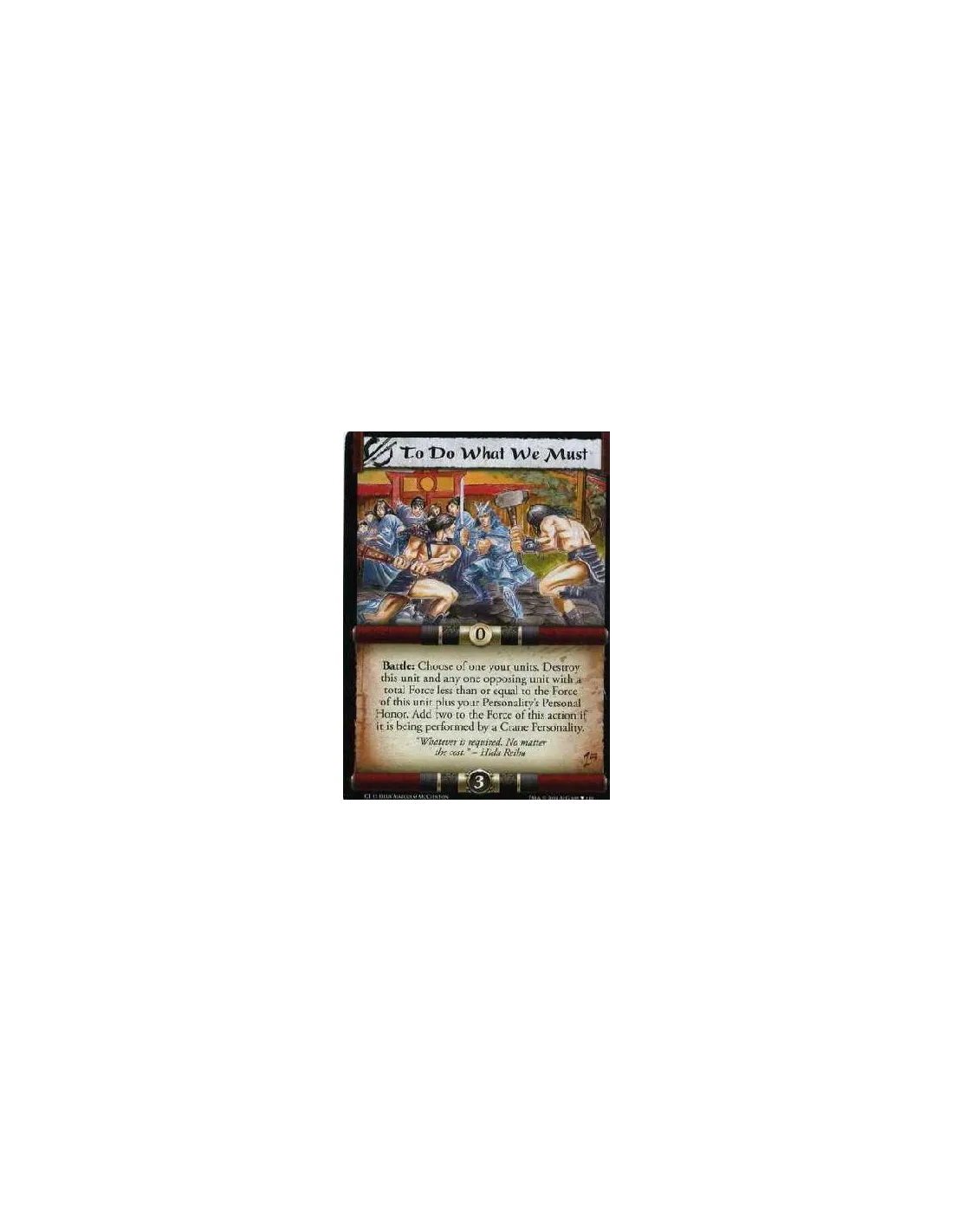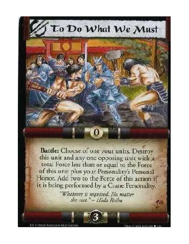 Battle: Choose one of your units. Destroy this unit and one opposing unit with a total Force less than or equal of this unit plus your Personality's Personal Honor. Add two to the Force of this action if it is being performed by a Crane Personality.
