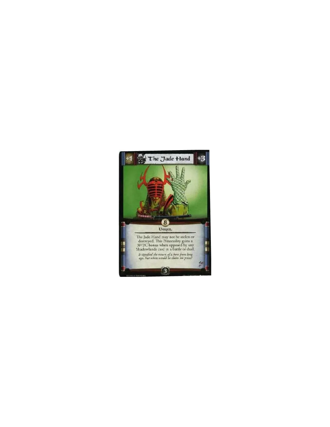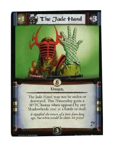 Unique. The Jade Hand may not be stolen or destroyed. This Personality gains a 3F/2C bonus when opposed by any Shadowlands cards in a battle or duel.