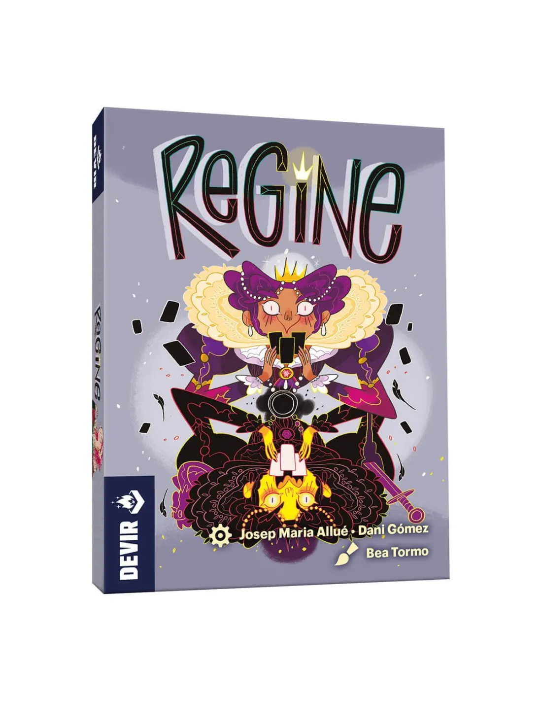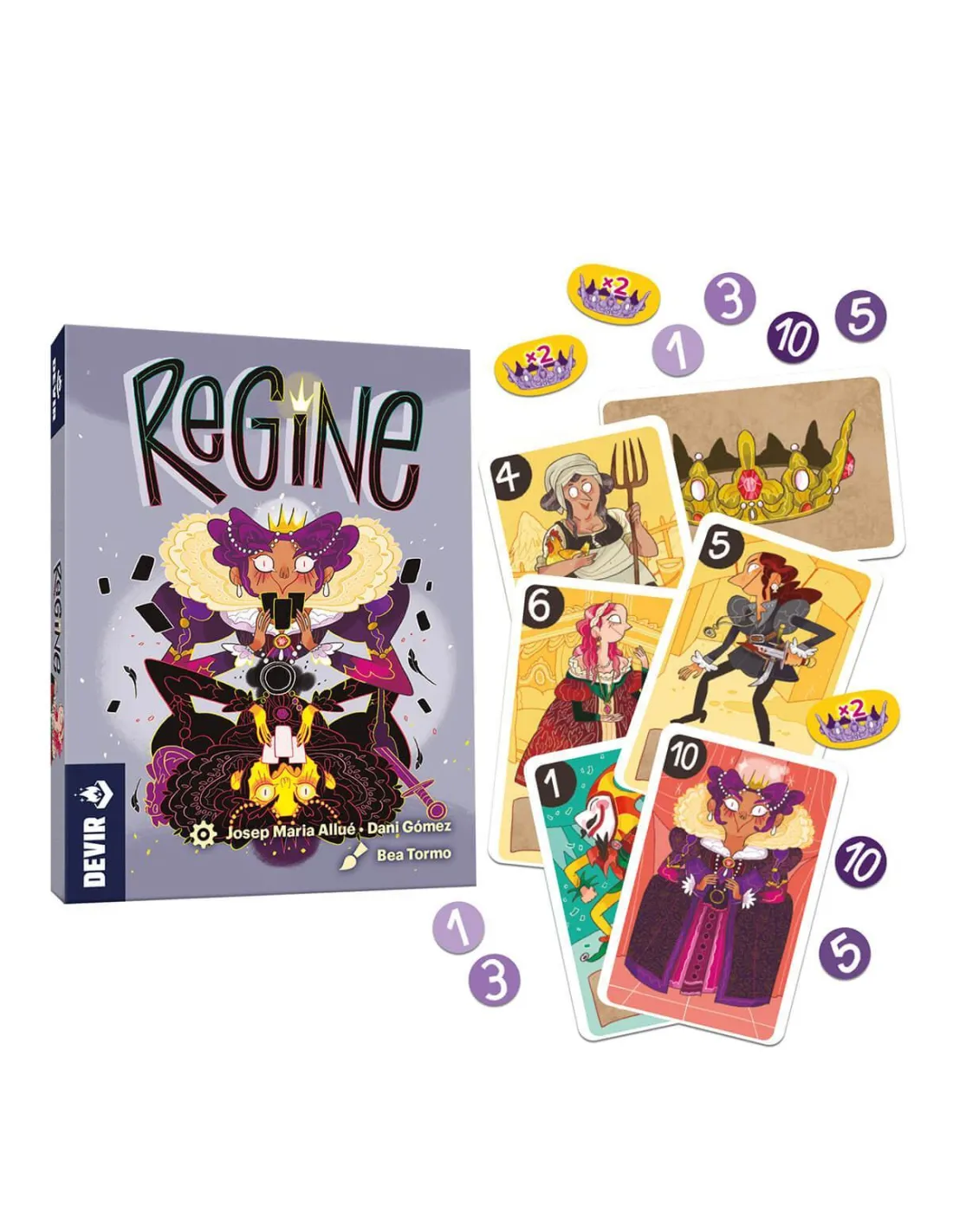 Regine es un juego de cartas con apuestas diseñado por Dani Gómez y Josep M. Allué, autor de juegos como El monstruo de colores, Castellers! o Dragones y gallinas. Ilustrado por Bea Tormo, pueden participar entre 2 y 4 personas a partir de 10 años en partidas que duran unos 30 minutos. El juego nos traslada a las cortes europeas de finales del siglo XVI y el objetivo consiste en ser el primero en alcanzar 31 puntos. Vigilad vuestras espaldas... ¡Porque los puñales vuelan! En Regine la interacción entre los jugadores es constante, ya que la mayoría de los efectos de las cartas actúan sobre la mano de los rivales. A lo largo de la partida, cada jugador buscará la mejor combinación para puntuar, pero no siempre tendrá el control sobre sus cartas. El diseño intuitivo de las cartas os permitirá aprender cómo funcionan muy rápido. Y si sabéis jugar al mus, puede que algunas reglas os resulten familiares. Las rondas se estructuran en 3 fases: construcción de la mano, en la que los jugadores trataran de conseguir una combinación favorable de cartas, las apuestas y la resolución. Para empezar, dejad en el centro de la mesa las cuatro cartas de puntuación y las 32 fichas de apuesta. Barajad las 40 cartas restantes, repartid 4, boca abajo, a cada jugador y dejad el resto en el centro de la mesa. ¡Ya está todo listo para empezar la primera fase! Por turnos, cada jugador puede hacer 3 acciones, una sola vez, en el orden que prefiera. La primera consiste en cambiar las cartas que quieran de su mano por cartas del mazo central o bien anunciar “No hay cambios”, cosa que bloquea la opción de cambiar cartas para el resto de jugadores. La segunda acción es jugar una carta de la mano para formar su combinación. Se puede hacer boca abajo o boca arriba. En caso de hacerlo boca arriba, se aplica inmediatamente el efecto de la carta. El bufón, por ejemplo, permite que todo el mundo pueda volver a cambiar cartas con el mazo central; la campesina obliga a otro jugador a escoger una carta de su mano y bajarla boca arriba aplicando su efecto; la asesina elimina una carta que esté sobre la mesa; la cortesana obliga a girar una carta que esté boca abajo; el trompetista permite mirar el mazo central y el caballero fuerza a otro jugador a sustituir una carta de su mano. Finalmente, la tercera acción que se puede llevar a cabo en esta fase es pasar. Cuando todos los jugadores pasan, se bajan boca abajo las cartas que todavía estuvieran en la mano y llega la fase de apuestas. Afilad el ingenio, ¡porque llega la hora de los faroles! Por turnos, los jugadores apostarán para sumar los puntos de las cartas de jugada. Se puntuará por el máximo de reinas y bufones, por tener parejas, dobles parejas o tríos y por la suma de los valores de las cartas. ¡Tener una buena mano no siempre es necesario para llevarse puntos! Siempre puedes hacer creer que esas cartas tapadas sobre la mesa tienen un valor u otro. En la última fase, la resolución, se muestran las combinaciones de todos los jugadores y se reparten los puntos. Las rondas se irán sucediendo hasta que alguien alcance los 31 puntos. Buena memoria y altas dosis de picardía serán vuestros mayores aliados en Regine, que asegura partidas rápidas y horas de diversión. Lo disfrutarán pequeños y mayores (probad a jugar con abuelos o suegros amantes de las cartas, enseguida le pillarán el tranquillo), familias y amigos. Eso sí, moveos con cautela entre caballeros y cortesanas, ¡no sea que os quedéis con las cartas equivocadas!