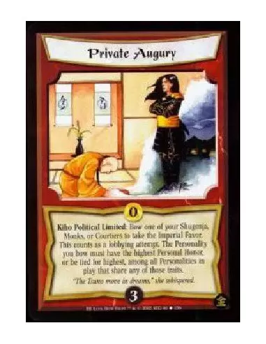 Kiho Political Limited: Bow one of your Shugenja, Monks, or Courtiers to take the Imperial Favor. This counts as a lobbying attempt. The Personality you bow must have the highest Personal Honor, or be tied for highest, among all Personalities in play that share any of those traits.