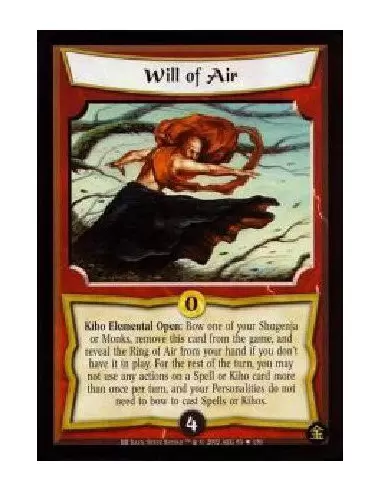 Kiho Elemental Open: Bow one of your Shugenja or Monks, remove this card from the game, and reveal the Ring of Air from your hand if you don't have it in play. For the rest of the turn, you may not use any actions on a Spell or Kiho card more than once per turn, and your Personalities do not need to bow to cast Spells or Kihos.