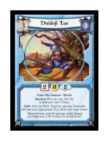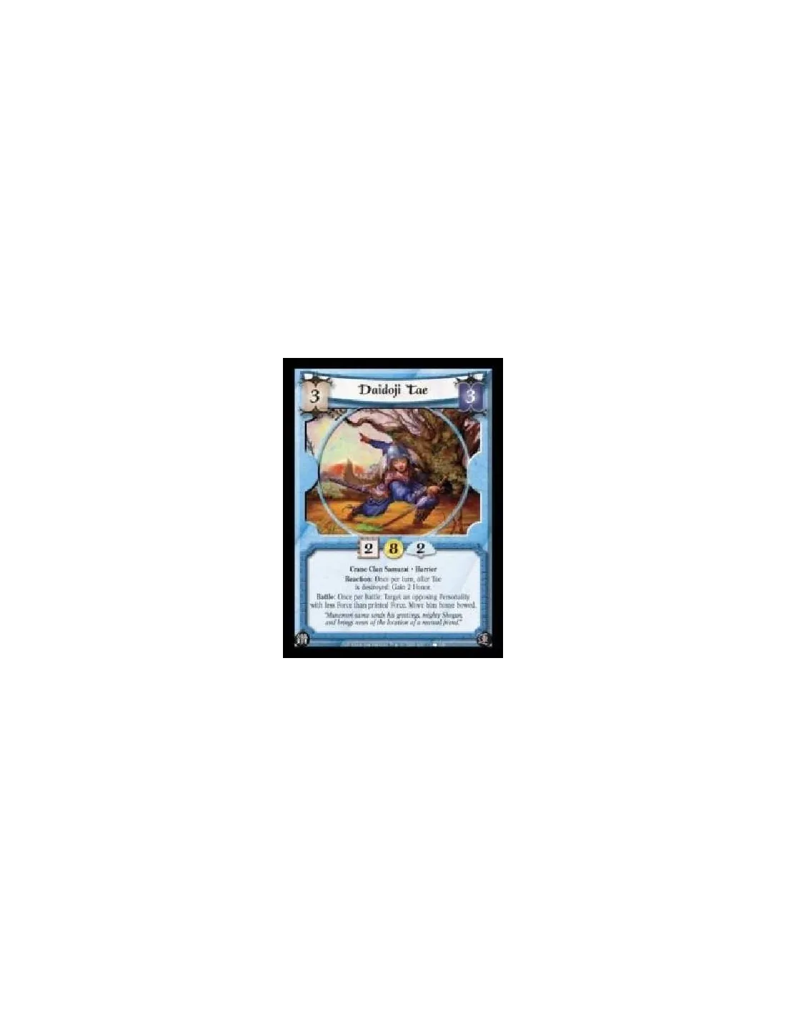 Crane Clan Samurai · Harrier. Reaction: Once per turn, after Tae is destroyed: Gain 2 Honor. Battle: Once per battle: Target an opposing Personality with less Force than printed Force. Move him home bowed.