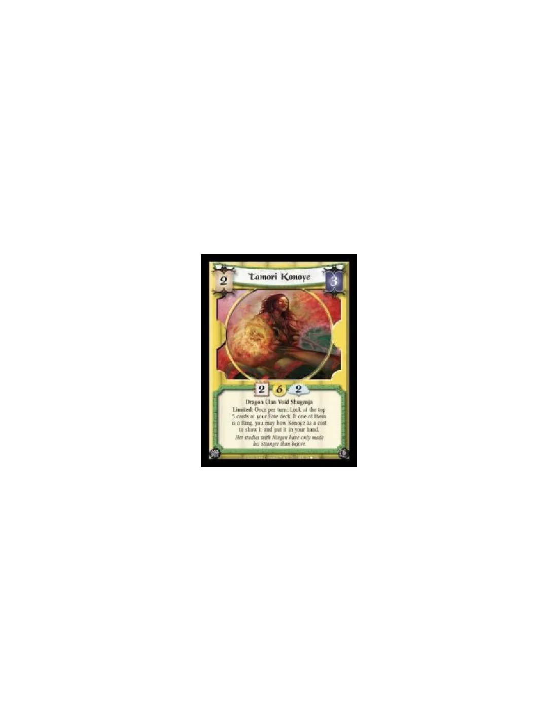 Dragon Clan Void Shugenja. Limited: Once per turn: Look at the top 5 cards of your Fate deck. If one of them is a Ring, you may bow Konoye as a cost to show it and put it in your hand